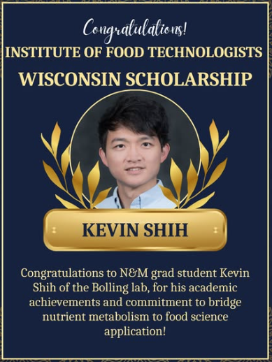 Congratulations to N&M grad student Kevin Shih of the Bolling lab, who received a Institute of Food Technologists Wisconsin scholarship for his academic achievements and commitment to bridge nutrient metabolism to food science application!